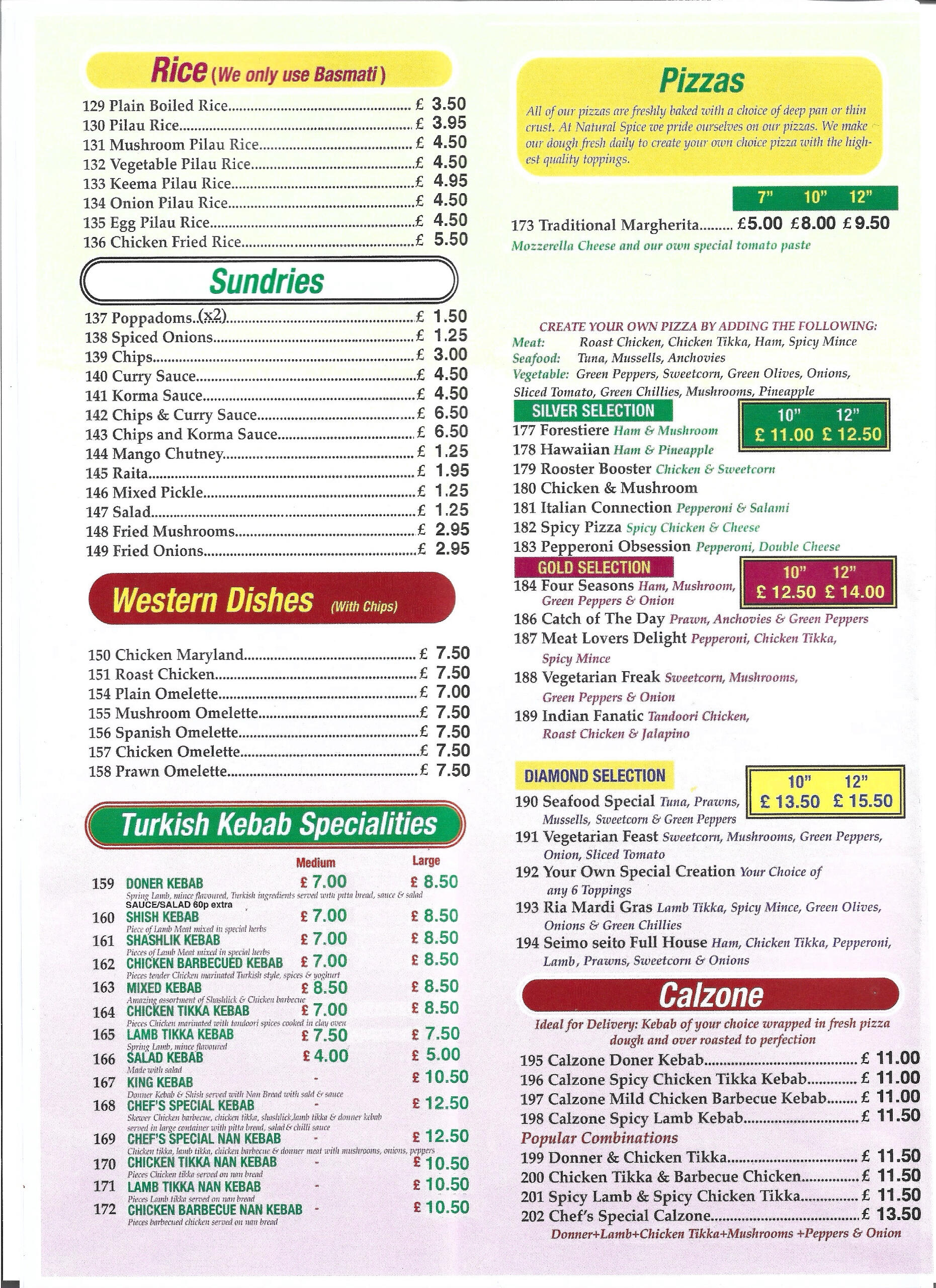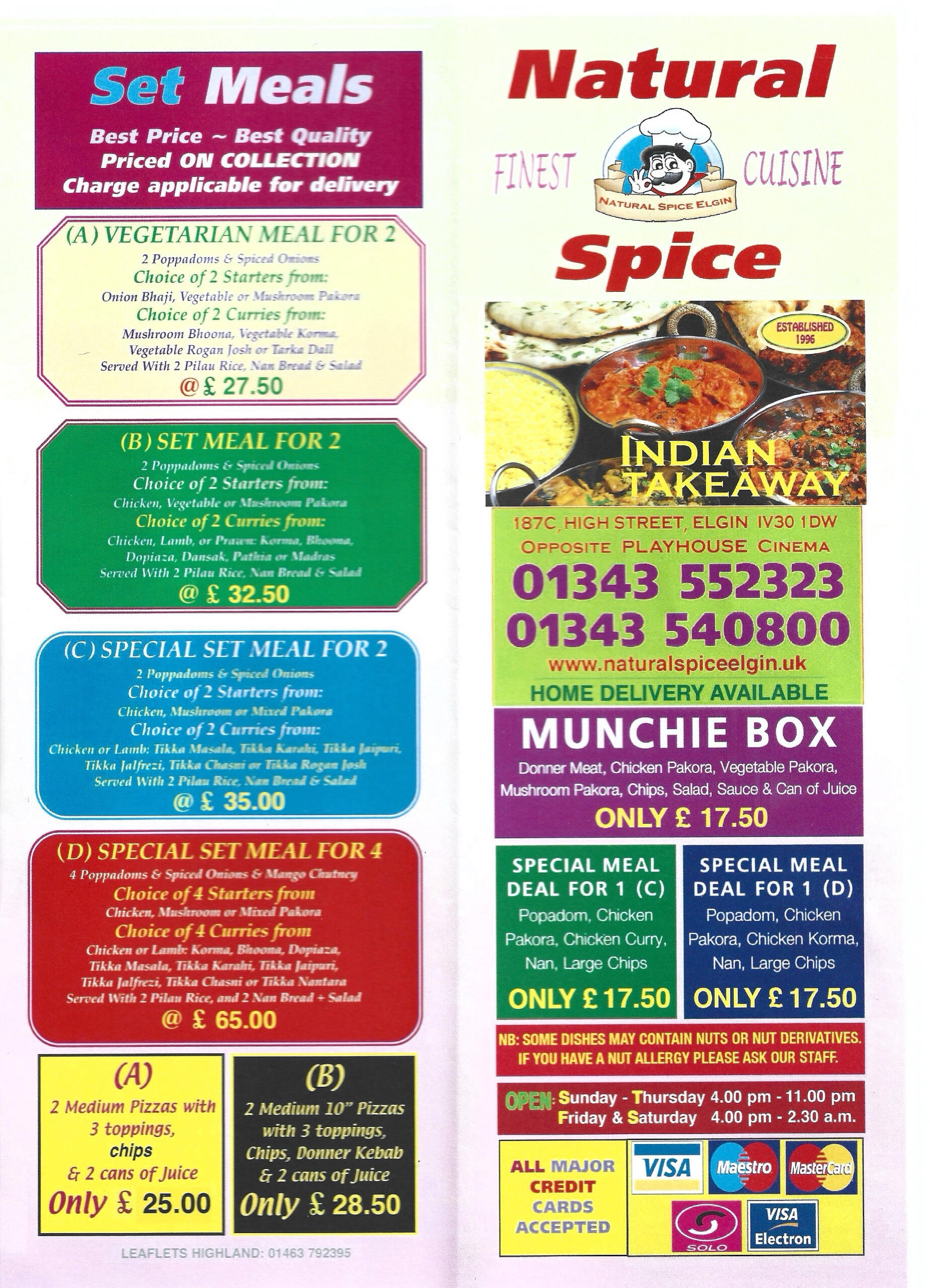 Natural Spice cater for patrons in the Elgin area requiring the finest Indian Cuisine, they can also supply Pizzas and Turkish Kebabs. To see full Menu, click on the MENU, choose meal and telephone your order at the numbers provided.